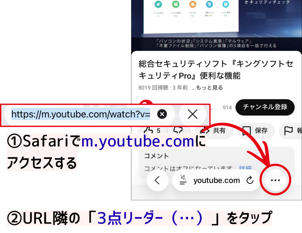 - SafariでWEB版YouTubeを開く (m.youtube.com にアクセスしてください)
