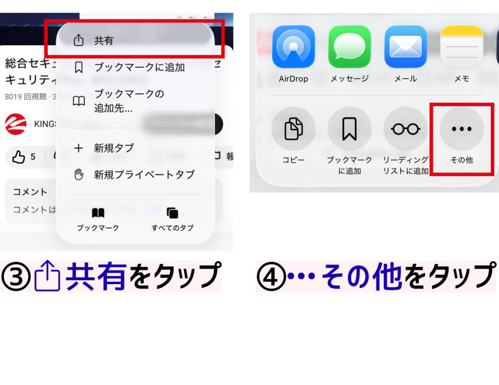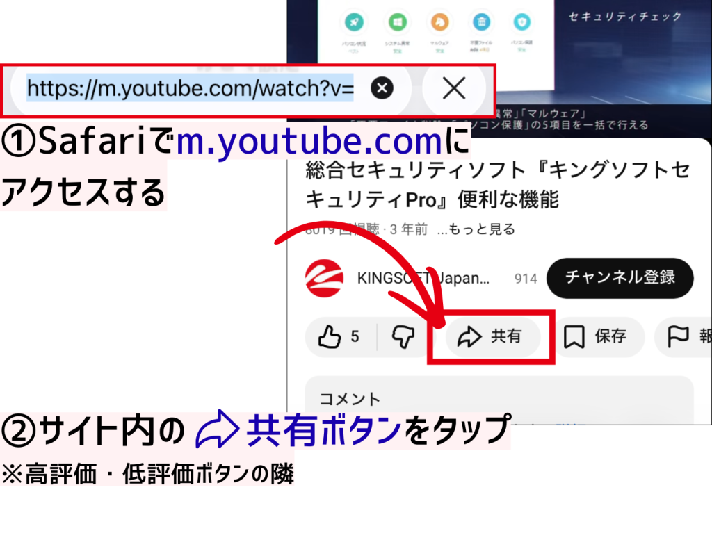 - YouTubeサイト内の「共有」ボタンをタップ