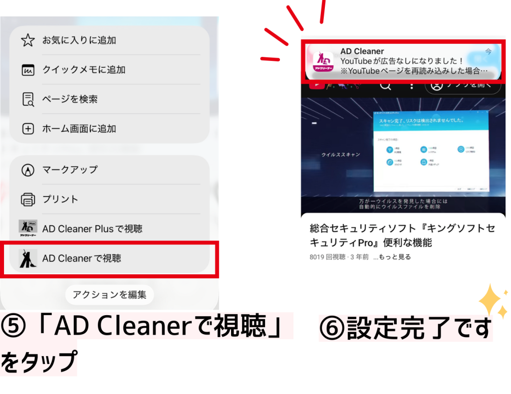 ※動画のすぐ下、高評価・低評価ボタンの並びにあるアイコンです - 「AD Cleanerで視聴する」を選択
