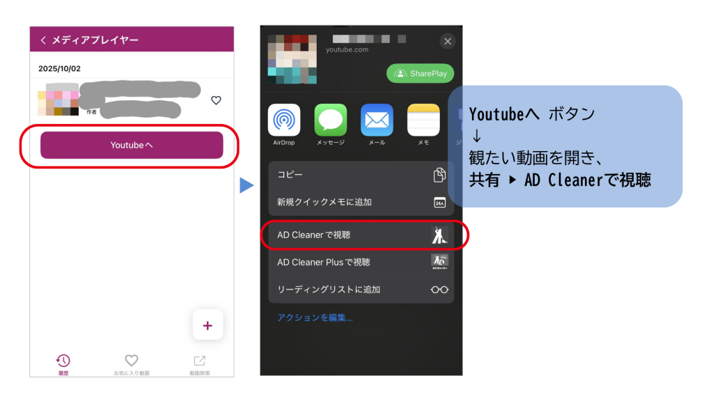YouTubeの広告をブロックする場合は、アドクリーナーのメディアプレイヤーまたはSafari(iOS版のみ)にて、動画を視聴する必要があります。