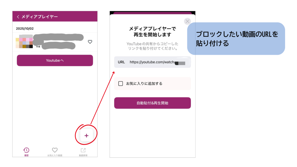 また、+ボタンから動画のURLを貼り付けてメディアプレイヤーで再生することもできます。